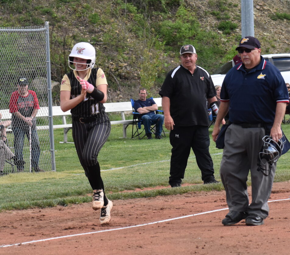 Photo by Kim North Monroe Central’s Kennadi Jorris celebrates her three-run homer during the third inning of Tuesday’s OVAC Class 3A semifinal against Wheeling Central on Ben’s Field at the I-470 J.B. Chambers Complex in Elm Grove. The Seminoles prevailed, 5-2.