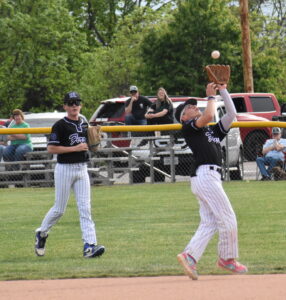 Photo by Kim North Martins Ferry second baseman Christian Shutler camps underneath a pop up during Monday’s OVAC Class 3A semifinal at Memorial Park in Barnesville. The fourth-seeded Purple Riders dropped a 4-3 verdict to the No. 1 Shamrocks. Barnesville will meet Wheeling Central Friday night at 7:30 at Mazeroski Field in Cadiz for the Class A championship. Martins Ferry right fielder Silas Simpson backs up the play.