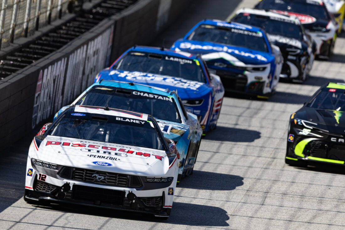 Ryan Blaney (12) leads Ross Chastain and the rest of the field during the start of a NASCAR Cup Series auto race, Sunday, April 12, 2026, in Bristol, Tenn. (AP Photo/Wade Payne)