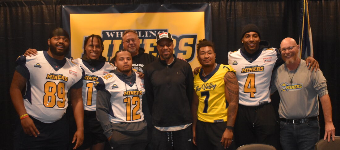Photo by Kim North Members of the Wheeling Miners professional indoor football team pose for a picture following a press conference on Thursday morning inside WesBanco Arena. From left are players Raushaun Nedd, and Isaiah Robinson, owner Chris Duffy, player Alex Coleman, head coach Chris McKinney, players Charles Westbrook and Daryll Clark and owner Dempsey Fields. The Miners make their 2026 America Arena League home debut on Saturday, May 2 against the defending league champion Jersey Bearcats.