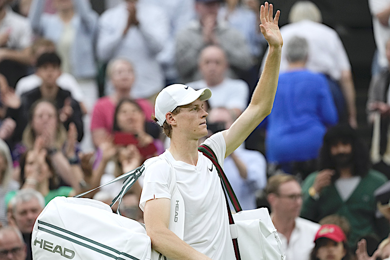 Jannik Sinner of Italy waves as he leaves the court following his quarterfinal loss to Daniil Medvedev of Russia at the Wimbledon tennis championships in London, Tuesday, July 9, 2024. (AP Photo/Alberto Pezzali)