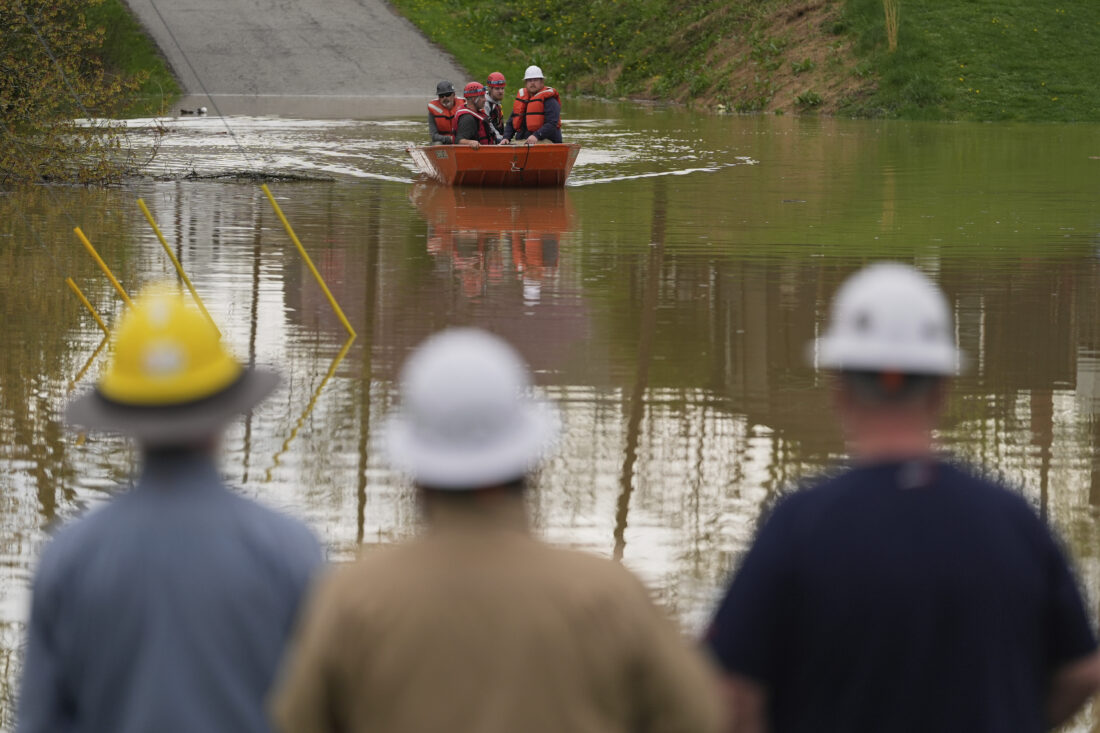 Pendleton County personnel use a boat to cross Max Goldberg Park after cutting power from a utility pole as the rising Licking River overflows its banks, Saturday, April 5, 2025, in Falmouth, Ky. (AP Photo/Carolyn Kaster)