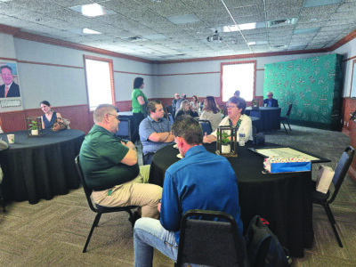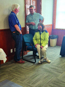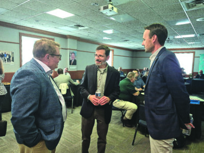 Belmont County Commissioners Jerry Echemann, left, and J.P. Dutton, right, congratulate David Rohall, dean of Campus and Community Relations for OUE, on his plans to step down as dean and return to the faculty May 15. A reception was held Friday in the OUE Community Room in Rohall’s honor. Commissioner Vince Ginanangeli also was on hand for the event.