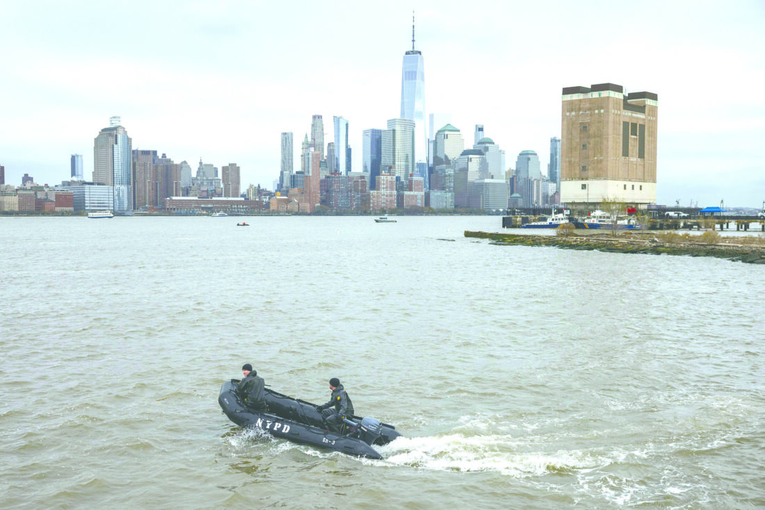 A New York Police Department scuba team looks for debris, Friday, April 11, 2025, where a sightseeing helicopter crashed a day earlier into the Hudson River in Jersey City, N.J. (AP Photo/Yuki Iwamura)
