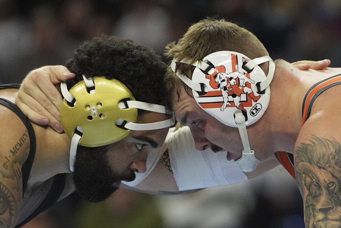 FILE - Oklahoma State's Wyatt Hendrickson, right, takes on Minnesota's Gable Steveson during a 285-pound match in the finals at the NCAA wrestling championship, March 22, 2025, in Philadelphia. (AP Photo/Matt Rourke, file)