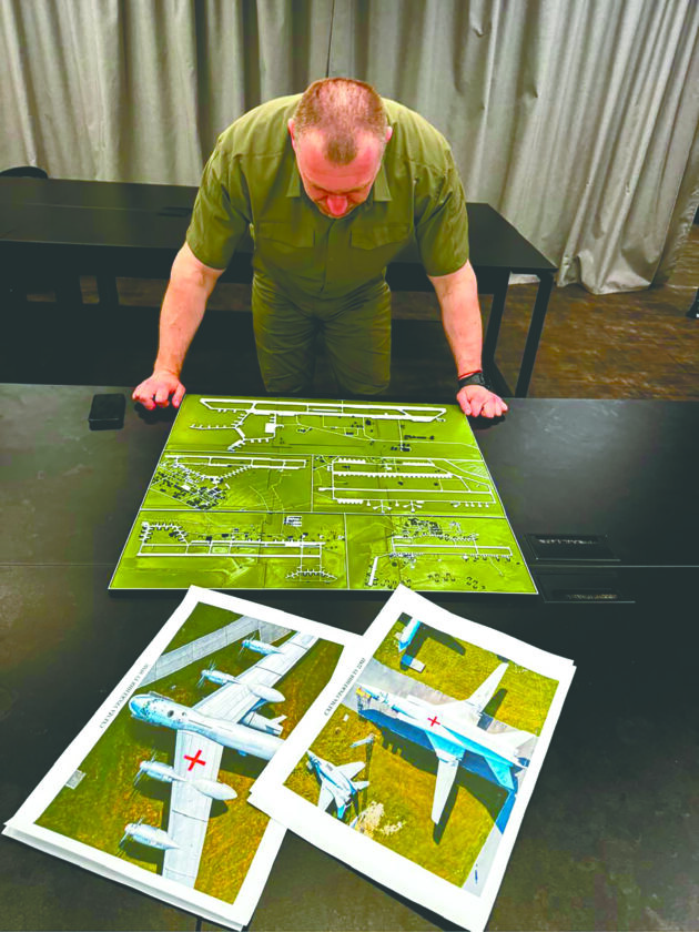 In this undated photo provided by the Ukrainian Security Service, head of the Security Service Vasyl Malyuk studies a photo of a map of Russia's strategic aviation location in his office in Ukraine. (Ukrainian Security Service via AP)