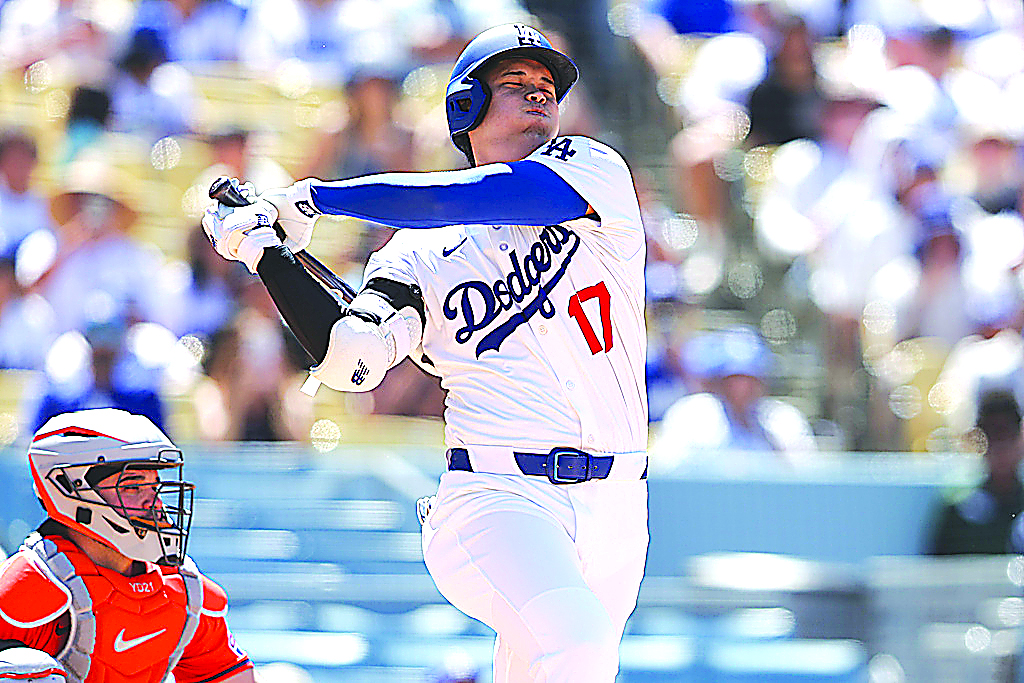 Los Angeles Dodgers designated hitter Shohei Ohtani swings during the eighth inning of a baseball game against the Houston Astros, Sunday, July 6, 2025, in Los Angeles. (AP Photo/Jessie Alcheh)