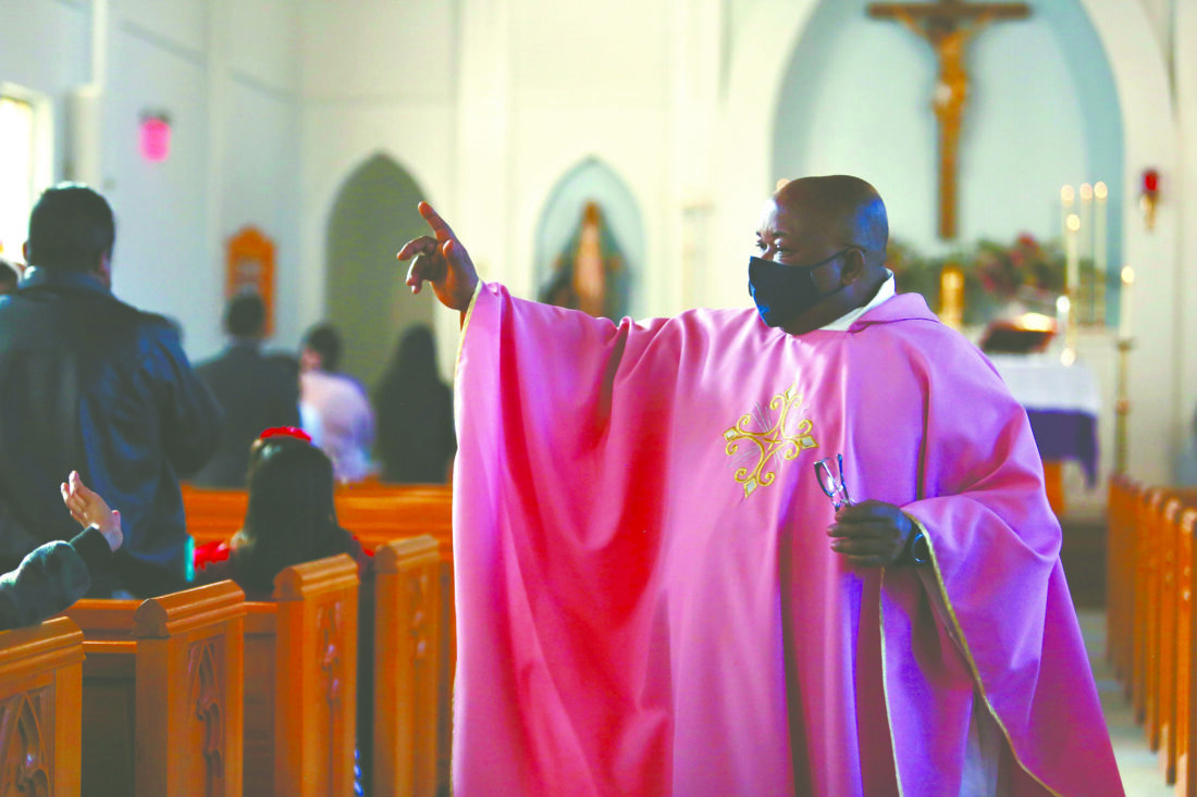 FILE - The Rev. Athanasius Abanulo waves to his parishioners after Mass on Dec. 12, 2021, at Immaculate Conception Catholic Church in Wedowee, Ala. (AP Photo/Jessie Wardarski, File)