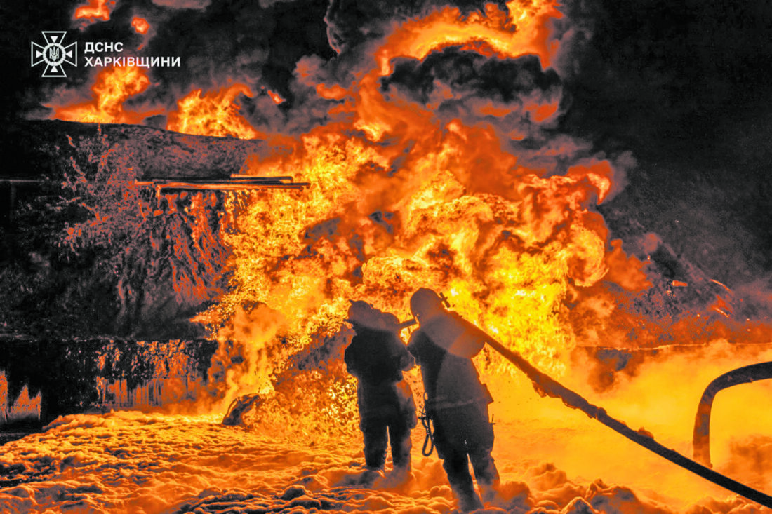 In this photo provided by the Ukrainian Emergency Service, emergency services personnel work to extinguish a fire following a Russian attack in Kharkiv region, Ukraine, Saturday, July 5, 2025. (Ukrainian Emergency Service via AP)