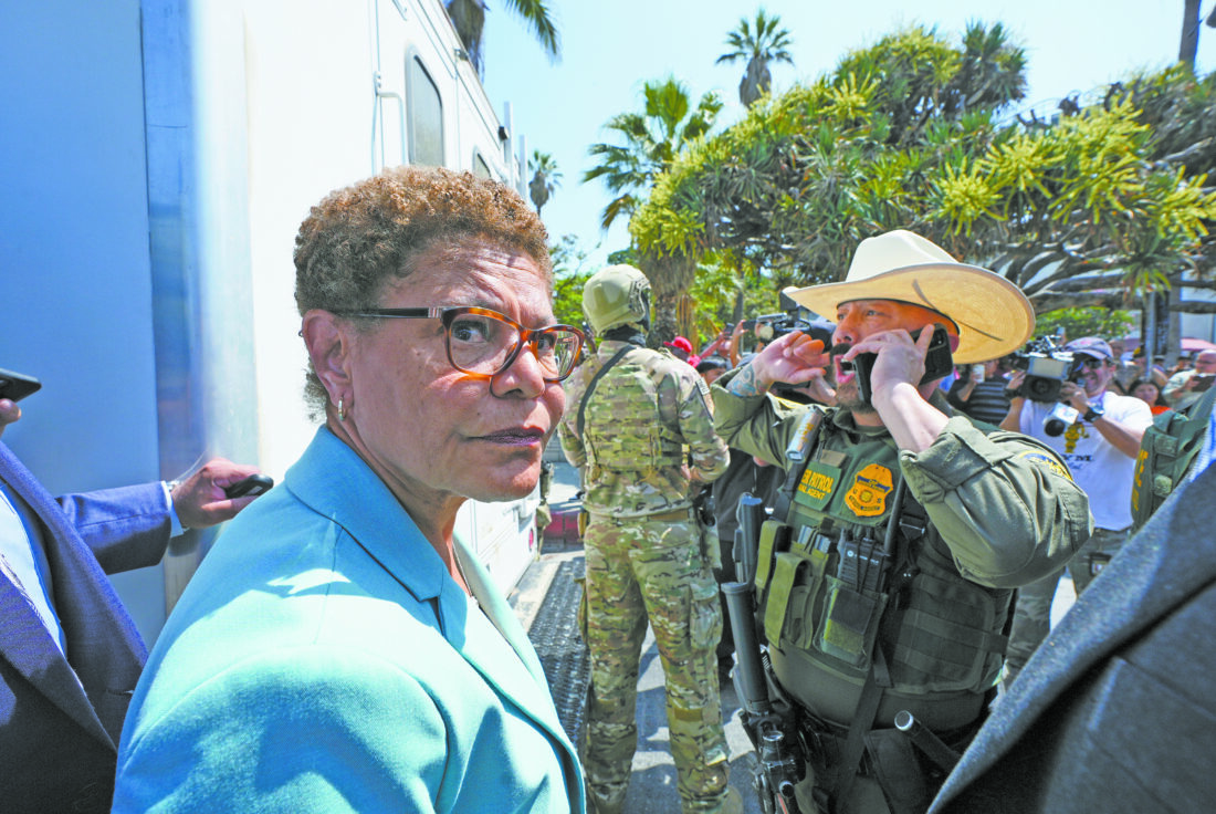 FILE - Los Angeles Mayor Karen Bass stands in front of a Border Patrol federal agent at MacArthur Park in Los Angeles, on Monday, July 7, 2025. (AP Photo/Damian Dovarganes, File)