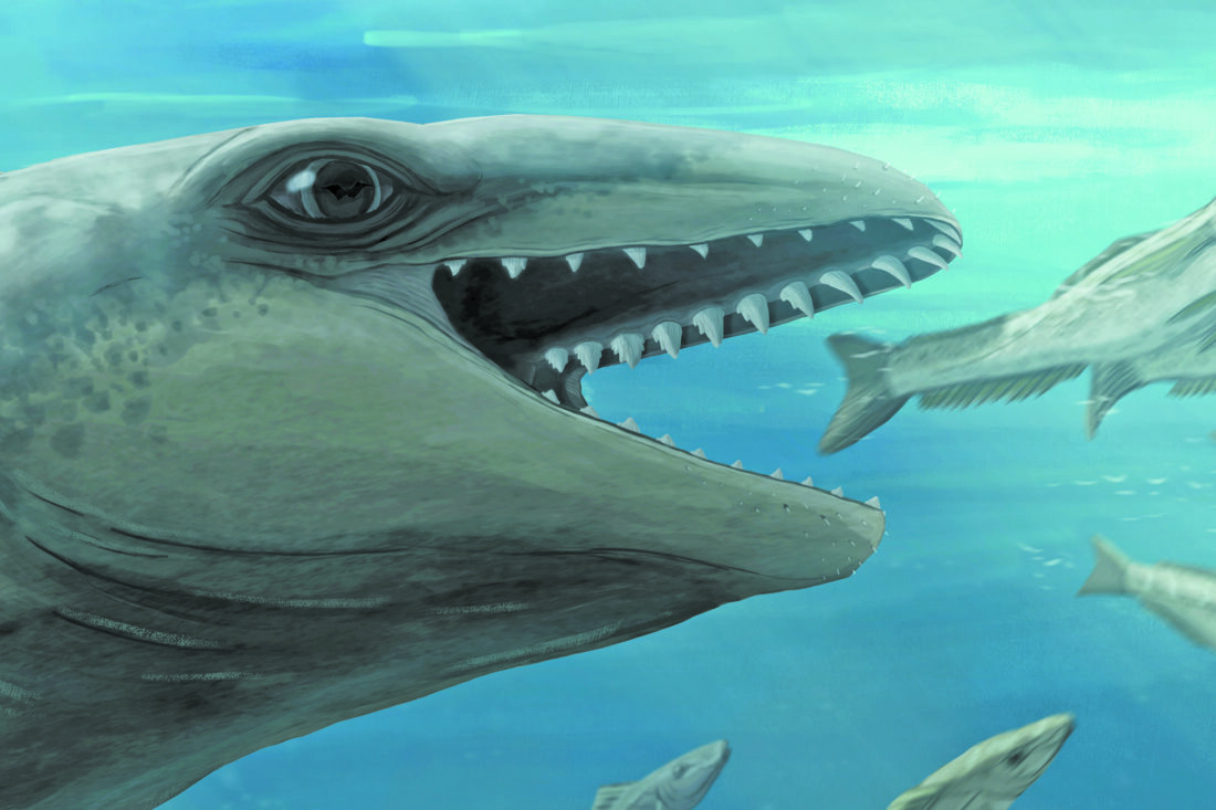 In this illustration provided by Ruairidh Duncan a Janjucetus dullardi is depicted chasing a fish. (Ruairidh Duncan via AP)