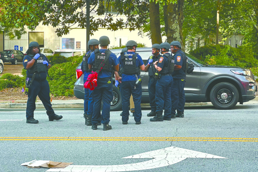DeKalb County firefighters gather outside an Emory University medical building in Atlanta on Friday, Aug. 8, 2025. (AP Photo/Jeff Amy)