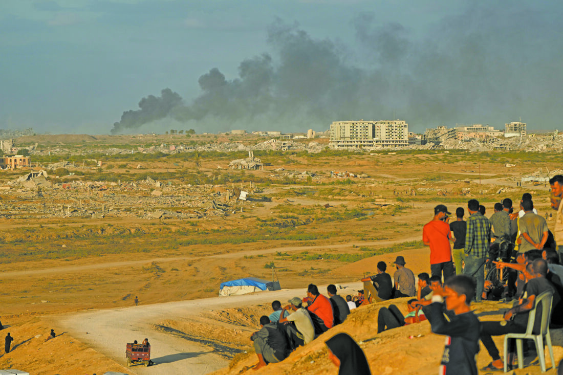 Displaced Palestinians watch smoke rise after Israeli military strikes as they gather on the coastal road near Wadi Gaza, in the central Gaza Strip, Thursday, Oct. 9, 2025. (AP Photo/Abdel Kareem Hana)