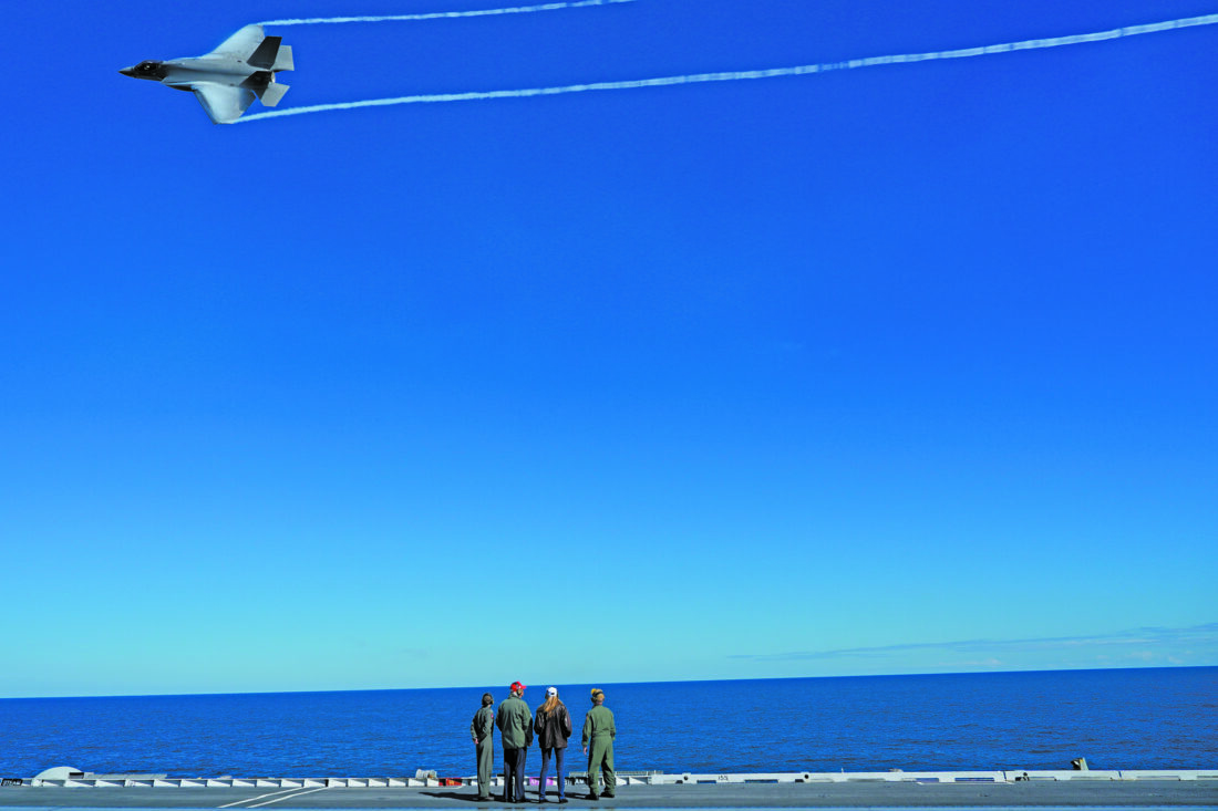 The Trumps then watched a military demonstration while standing on the deck of the aircraft carrier. Navy destroyers launched missiles and fired shells into the Atlantic Ocean, Navy SEALs descended from helicopters and fighter jets catapulted off.
