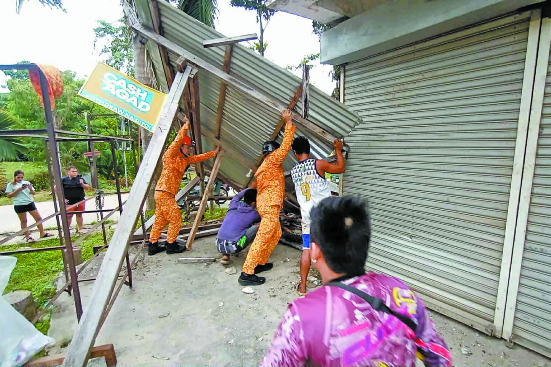 In this photo provided by the Bureau of Fire Protection, firefighters and residents hold on a toppled structure following a strong earthquake in Davao Oriental province, southern Philippines on Friday Oct. 10, 2025. (Bureau of Fire Protection via AP)