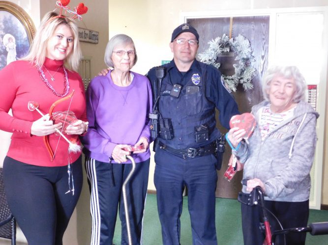 Ann Marie McConaghy, niece of St. Clairsville Mayor Kathryn Thalman, took up a toy Cupid’s bow and accompanied police Officer Greg Clark visiting older residents ...